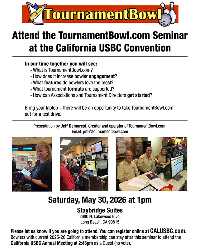 We look forward this season to some new tournaments and our regularly scheduled events. We hope to see everyone out on the lanes and show off that THE BEST BOWLERS come from CALIFORNIA!!